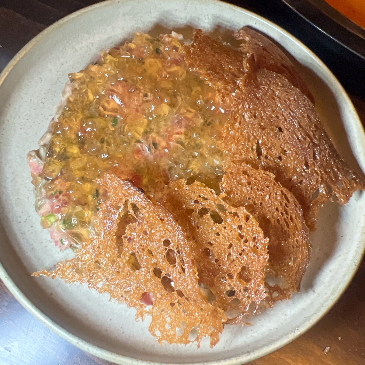 Tartare bavette d’Aloyau, gelée algues tabasco, graines coriandre, tuiles de pain 16€