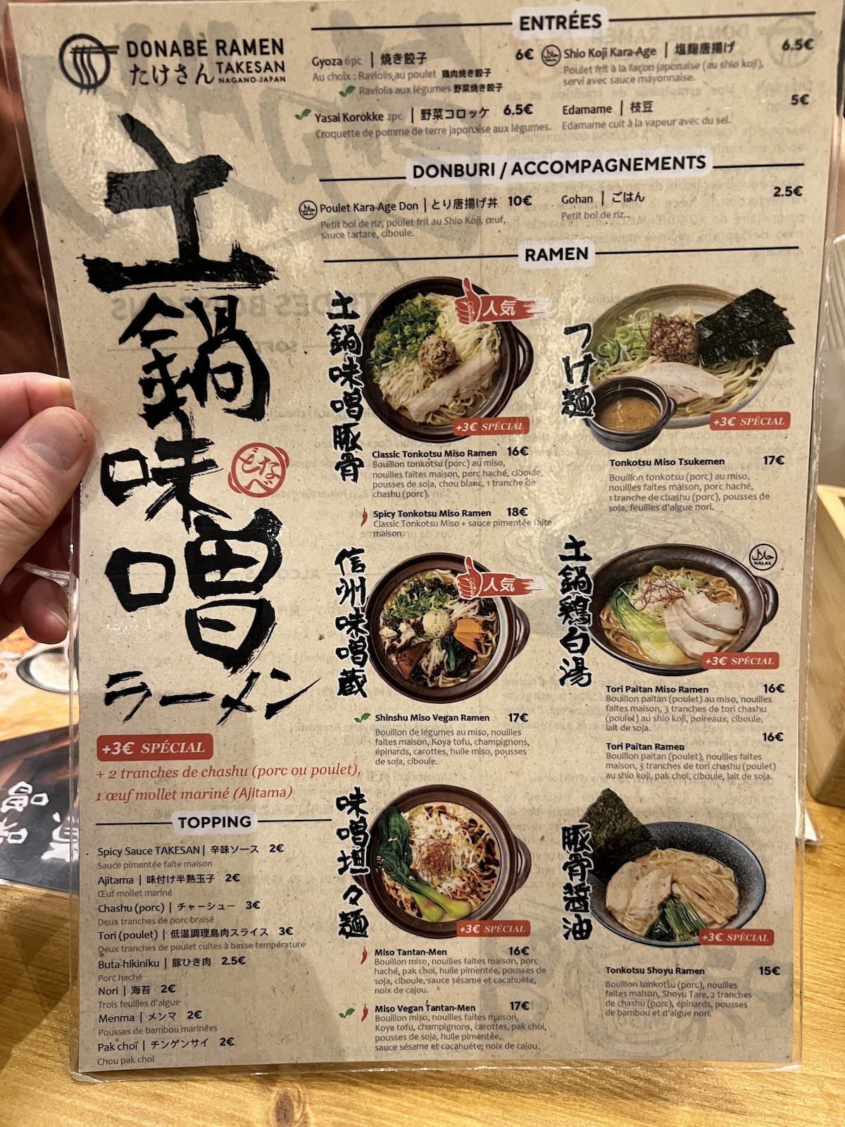 Takesan Donabe Ramen, meilleur ramen mangé depuis des lustres, dans mon top 3 direct avec Sanjo et Ramen Wagaya. , sauf qu’une lectrice m’a indiqué que selon elle Sanjo avait baissé lors de sa visite l’été dernier (je n’ai pas pu constater par moi-même) et qu’une autre m’a indiqué On m’a conseillé Ghido ramen comme un autre très bon ramen à essayer.