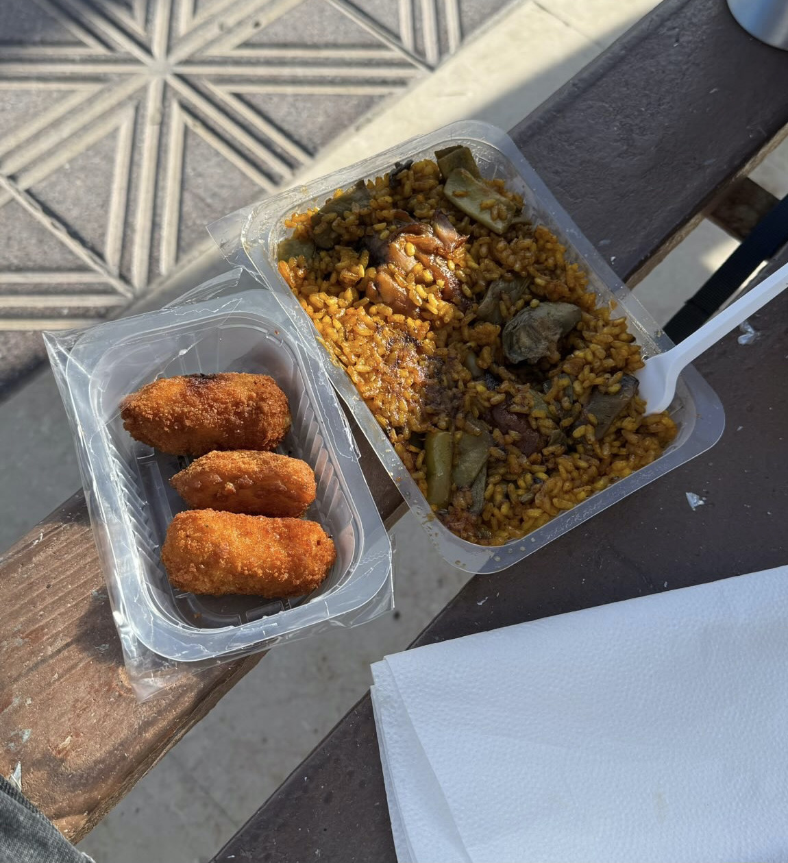Conseil d’un lecteur : “Je voudrais vous partager un bon plan. Dans le quartier de Cabanal-Canalemar. Petit traiteur à emporter, fait maison, à 2 pas de la plage. 7,2€ pour une portion de paella valencienne avec poulet, artichaut, fève romaine et haricot plat (4,5€) + 3 croquetas (morue, jambon, pollo) (0,90€ chacune).