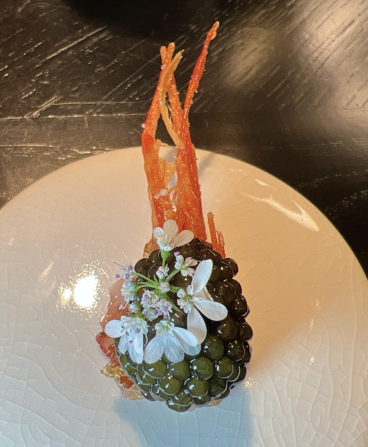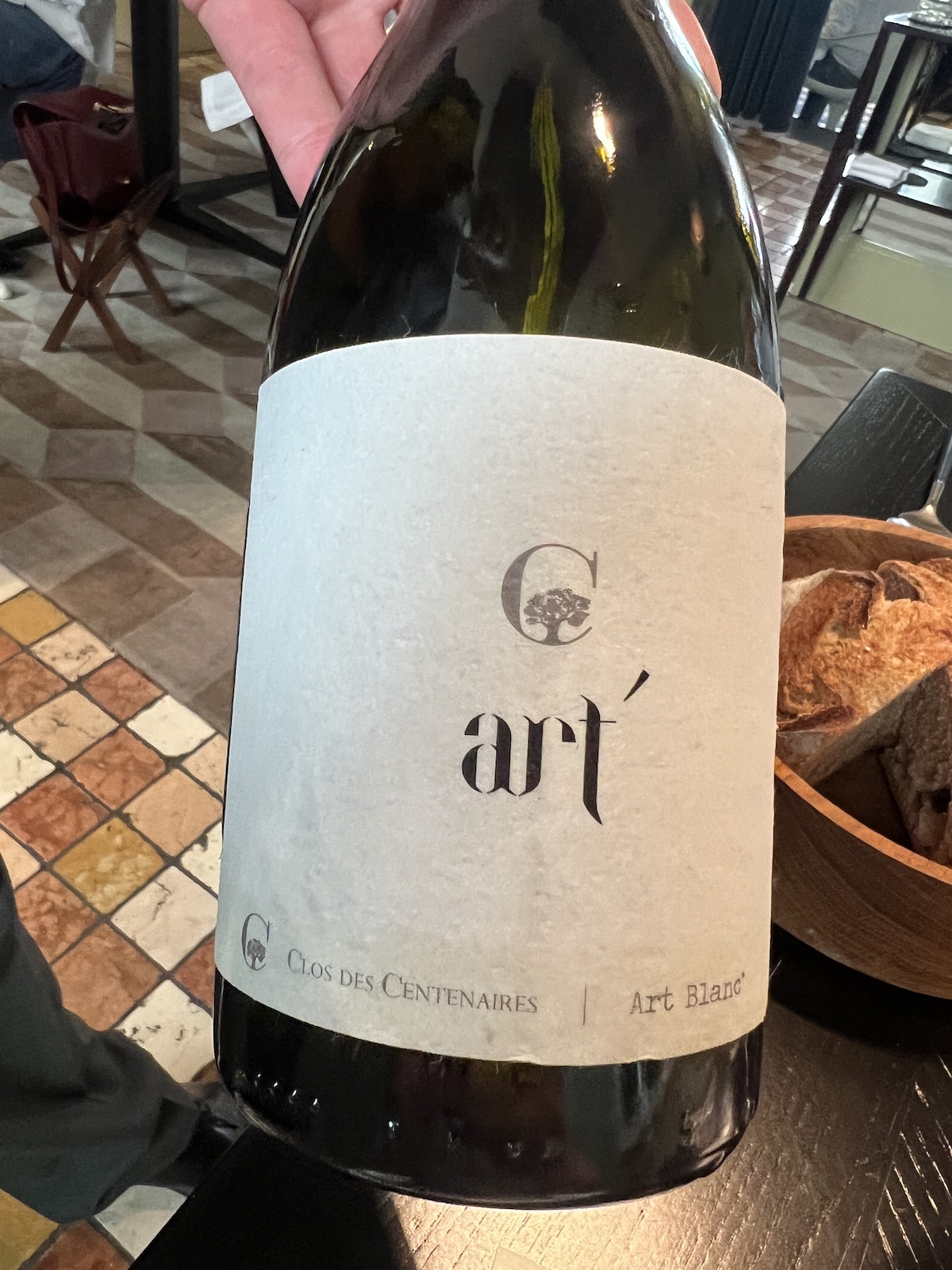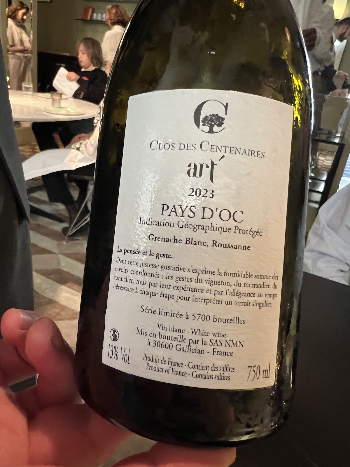 Pour accompagner ceci et l’entrée à venir, le sommelier avait prévu un vin de Camargue : Art Clos des Centenaires 2023, bon mais comme je l’évoquai précédemment, trop riche selon nous par rapport à la finesse de ces amuse bouches, il avait tendance à écraser.
