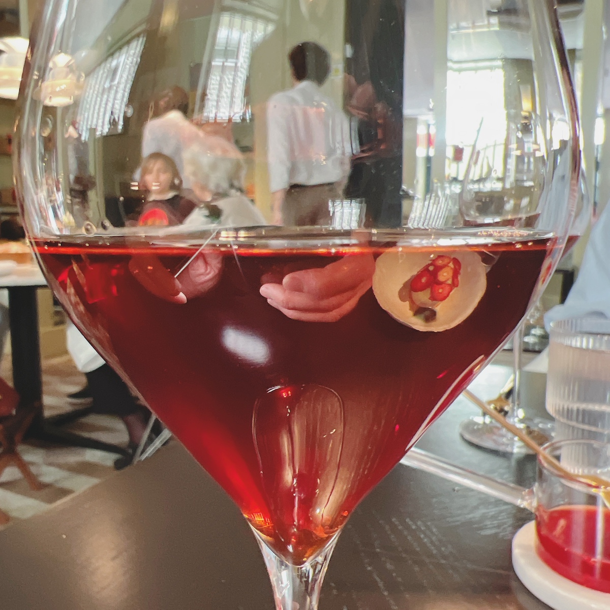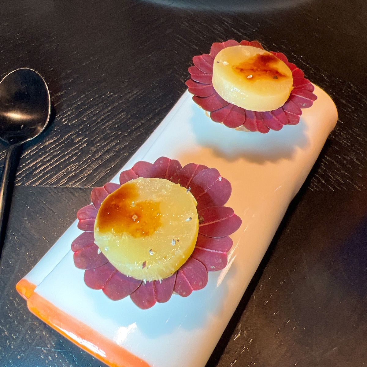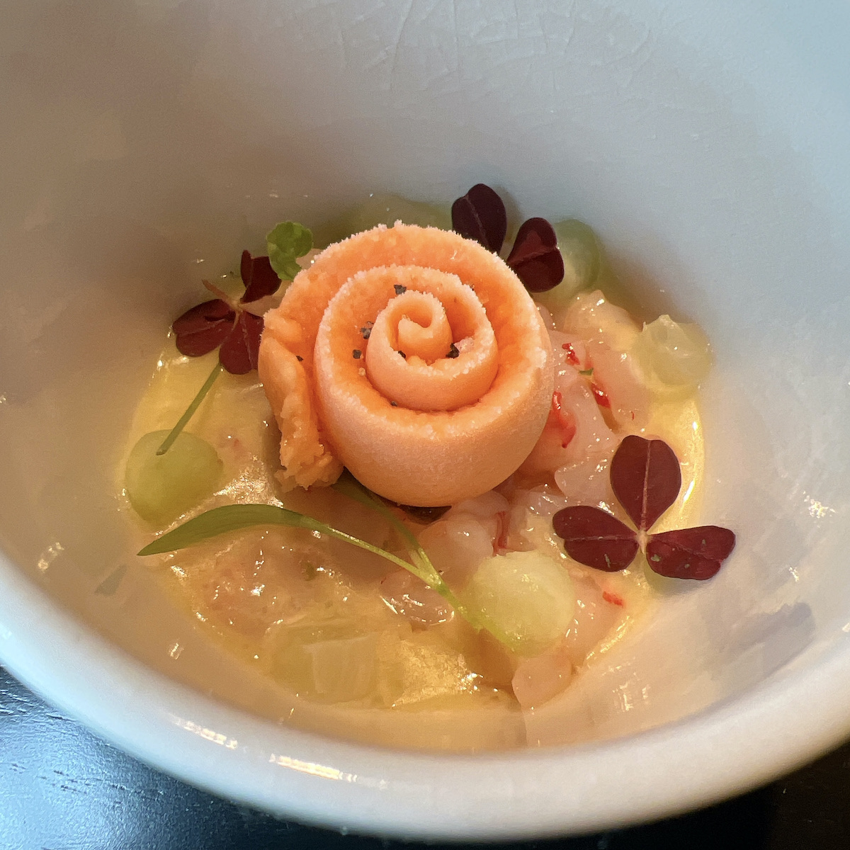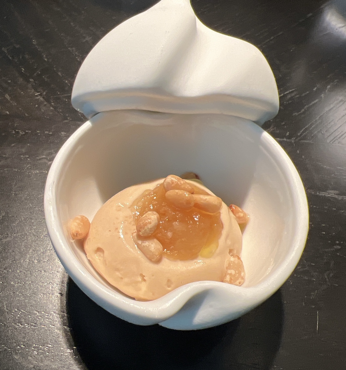 Pour accompagner ceci et l’entrée à venir, le sommelier avait prévu un vin de Camargue : Art Clos des Centenaires 2023, bon mais comme je l’évoquai précédemment, trop riche selon nous par rapport à la finesse de ces amuse bouches, il avait tendance à écraser.