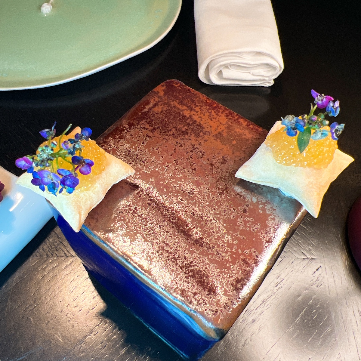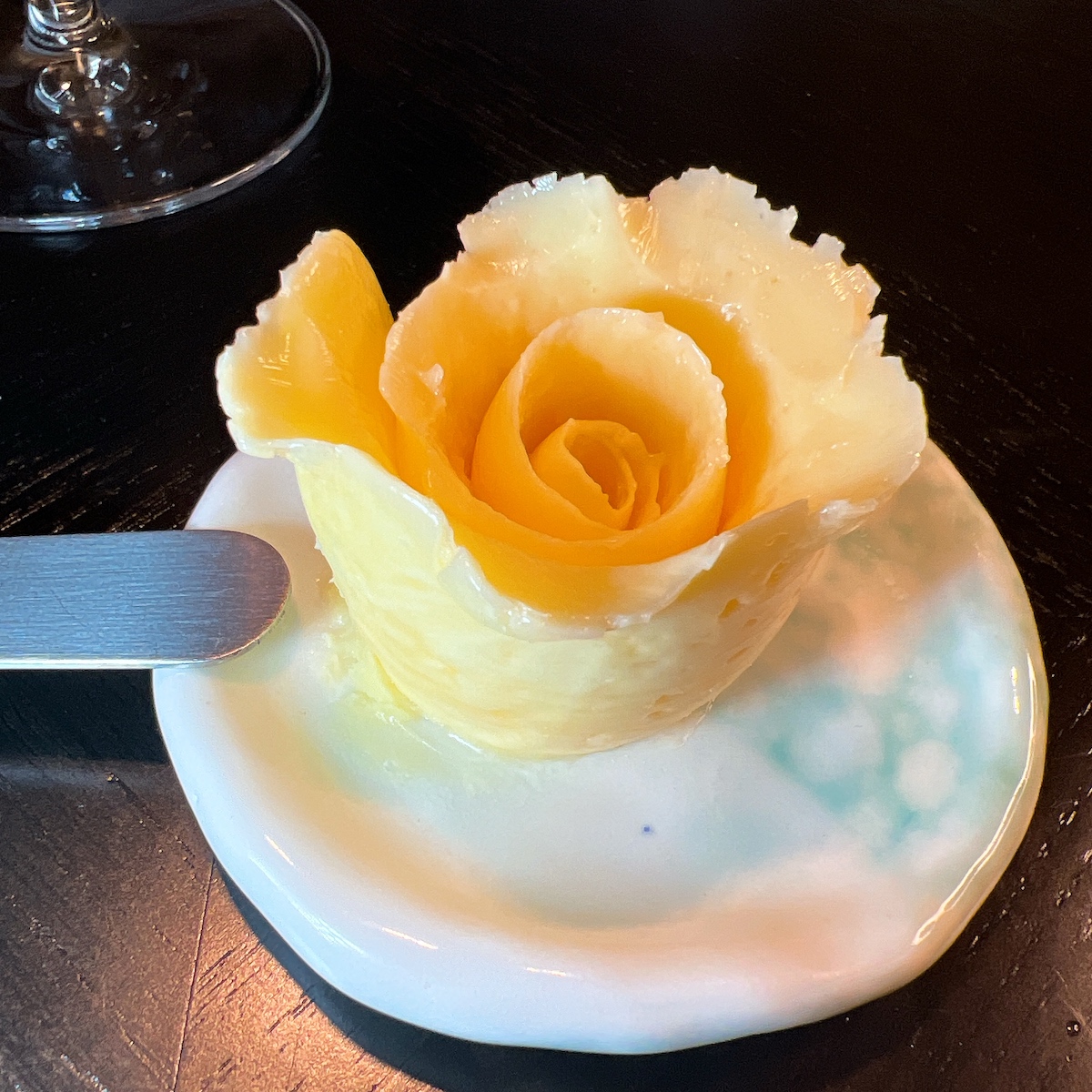 C’est désormais un classique en 2026, le pain et le beurre et le Brillat-Savarin à la truffe, ah j’oubliais, il y a aussi les bouteilles de Chartreuse en énorme à l’entrée du resto. Pour le pain et le beurre, je considère que c’est un piège, c’est sympa mais perso je ne vais pas dans un étoilé pour manger du pain et du beurre, aussi bon soit-il et je trouve toujours que c’est un moyen de caler alors que je préfèrerai avoir l’estomac disponible pour de la cuisine élaborée. Voilà, on va peut-être me trouver rabat-joie mais c’est ma réaction, cela étant, je l’ai mangé de bon coeur, mais je ne suis pas plus épaté que ça.