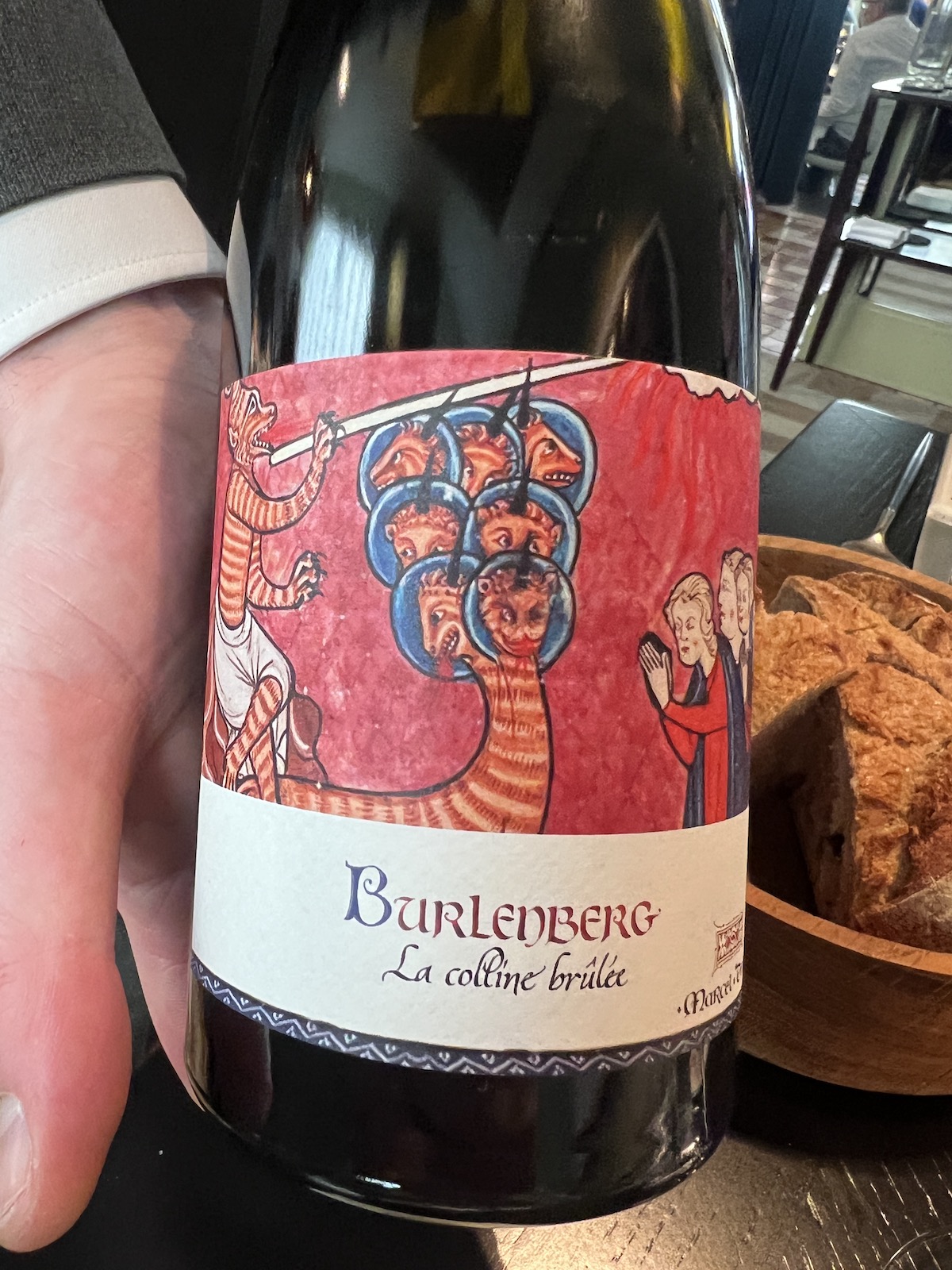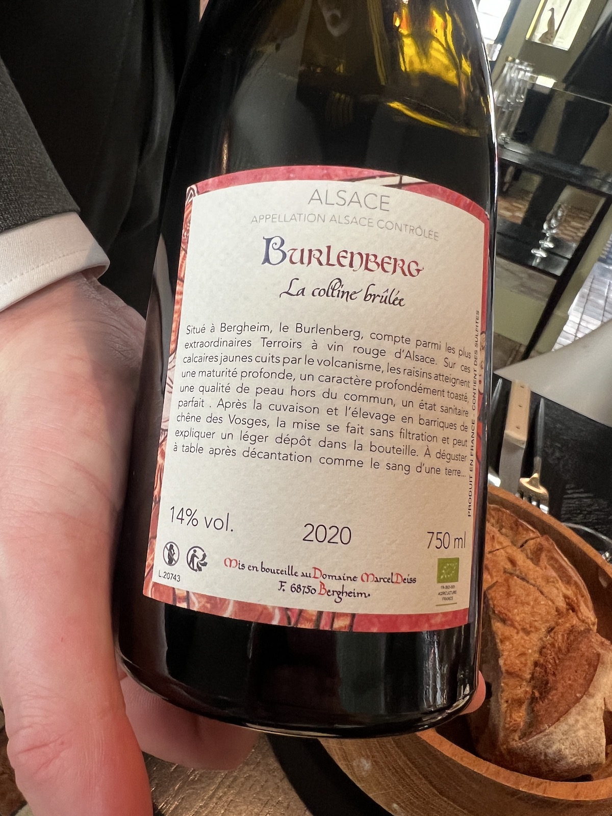 Pour le plat de viande, le filet de veau, le sommelier nous a sorti ce pinot noir d’Alsace, la Colline brûlée de Burlenberg de Marcel Deiss, ouah ça c’était dingue, aussi bien en bouche que dans l’accord avec le veau. Sans faute.