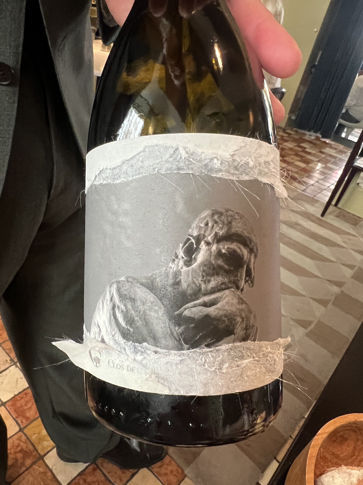 Le sommelier nous a montré plus tard durant le repas (en fait j’avais à nouveau besoin de la bouteille car mon appli photo avait gâché la photo) que le vigneron étant fan d’art, lorsqu’on déchirait l’étiquette, il y avait une oeuvre derrière, en l’occurrence ici un Penseur de Rodin.