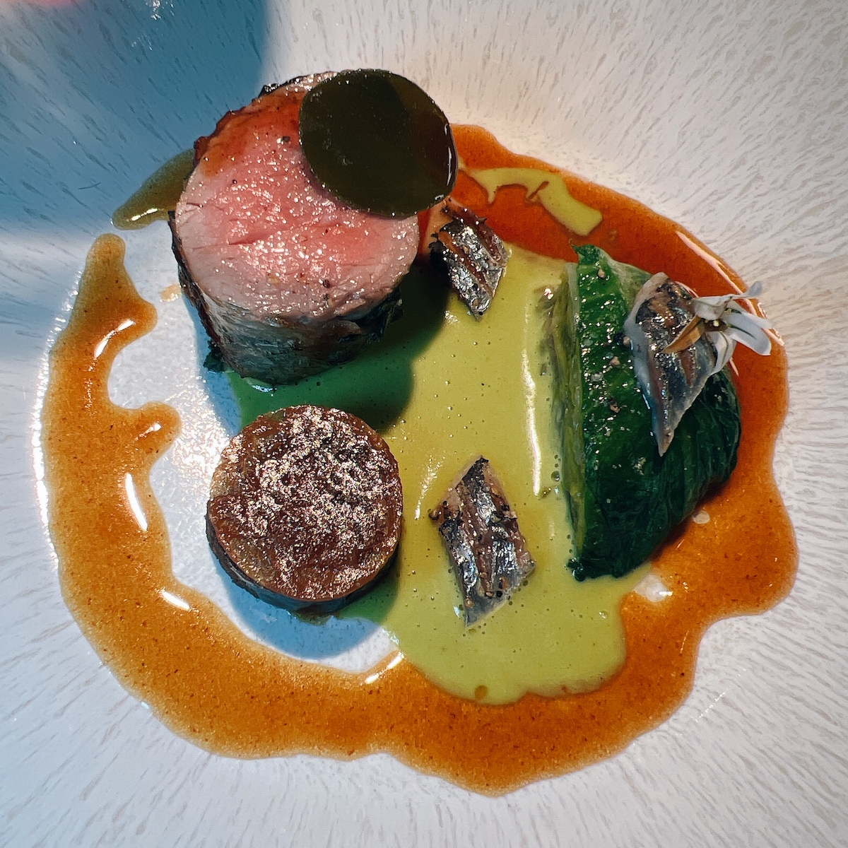 Filet de veau du Pays Basque rôti et joue tendrement braisée, sucrine fondante et sardine saisie d’effluves citronnées, onctuosité d’un beurre infusé aux feuilles de câprier et jus corsé de veau