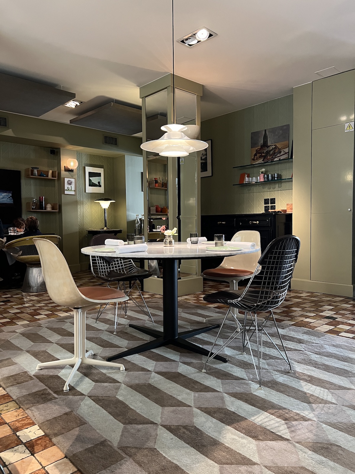Il y a deux salles séparées par une marche, nous étions dans celle du fond. Nous avions demandé une table tranquille et c’est ce que nous avons eu. Rien à redire dessus, nous étions très satisfaits. Par ailleurs j’ai beaucoup apprécié cette déco vintage, très années 30-50, qui avait du cachet sans être tape à l’oeil, elle apportait une certaine humanité au lieu. Par ailleurs cela change des décos souvent très homogènes dans bon nombre de restos chic. Ici même nos verres d’eau n’étaient pas identiques par exemple.