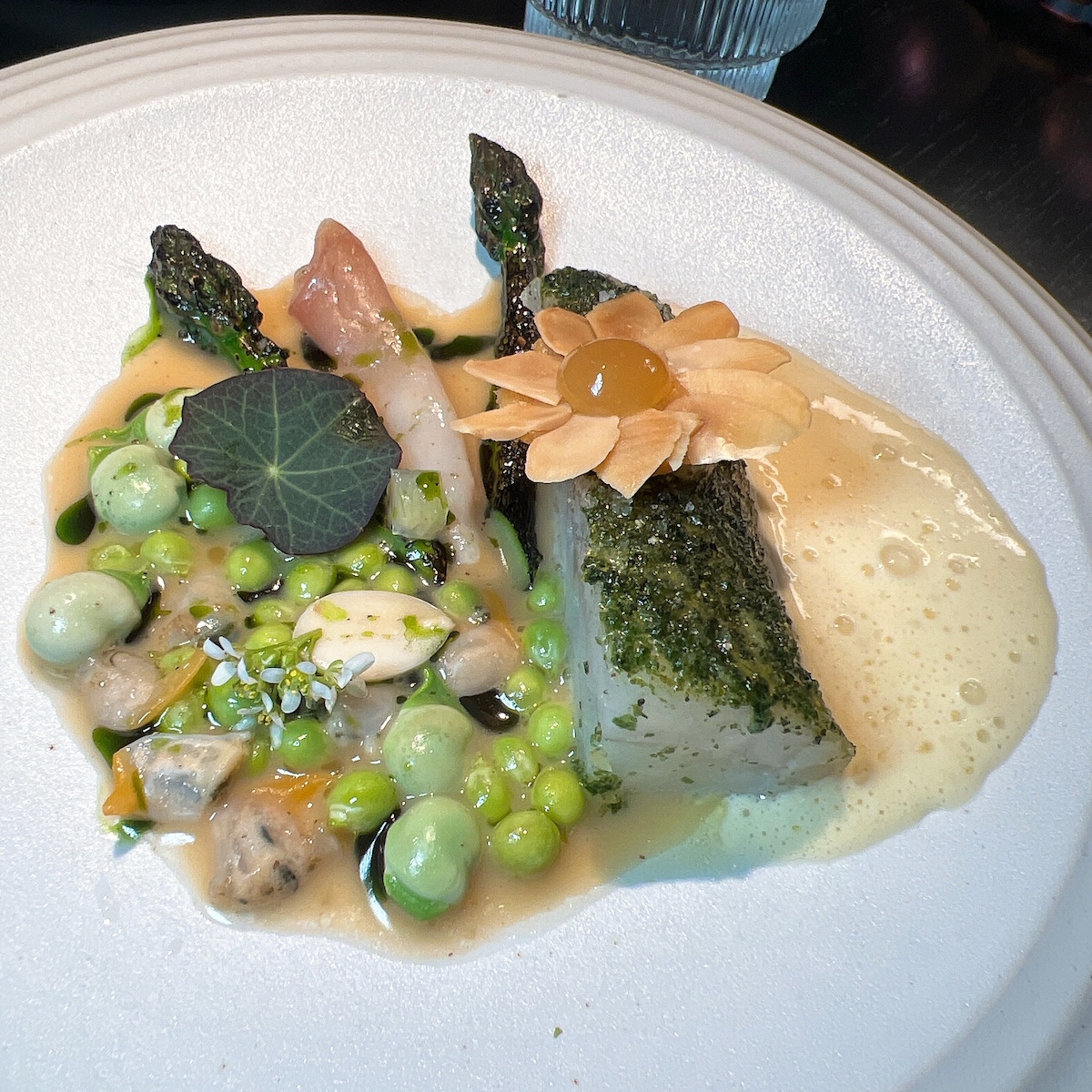 Turbot et coquillages en immersion d’algues bretonnes, asperge paysanne ferrée et petits pois goutte croquants, quintessence des arêtes citronnée et onctueux sabayon à l’huile d’amandon. Très bien mais fan de turbot, je le préfère un peu plus gourmand, disons un morceau un peu plus gros et un peu plus cuit, mais c’est une remarque personnelle qui n’engage que moi.