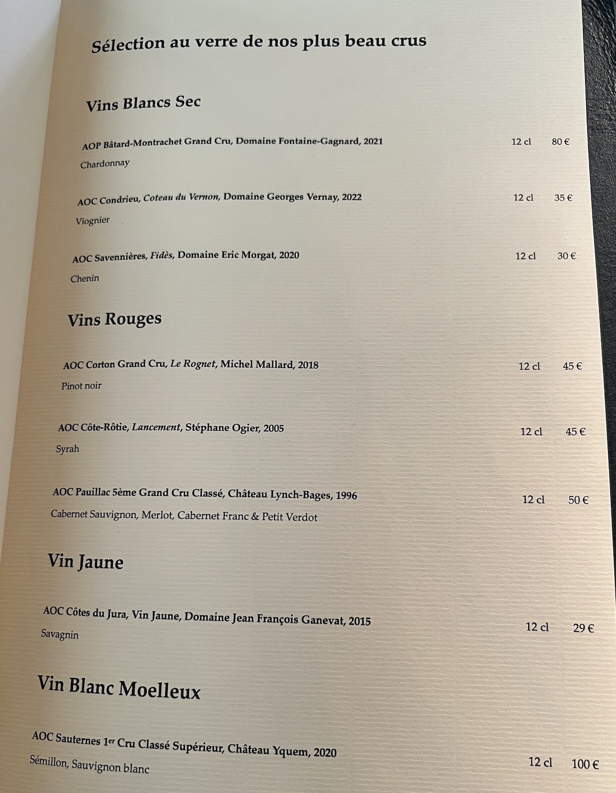 Un repas excellent, réchauffé par notre serveur Sévigné, mais sinon une vraie difficulté à entrer en communion avec le lieu, à se sentir à l’aise, c’était comme un film durant lequel on était censé se taire ou alors juste applaudir. Peut-être que c’est juste qu’on n’était pas sur la même longueur d’ondes mais le boulot d’un resto en général et d’un étoilé en particulier, c’est aussi de savoir établir le contact avec le client. Peut-être pourrai-je y revenir, vu l’excellent rapport qualité-prix de la cuisine, plus que des vins, à voir.