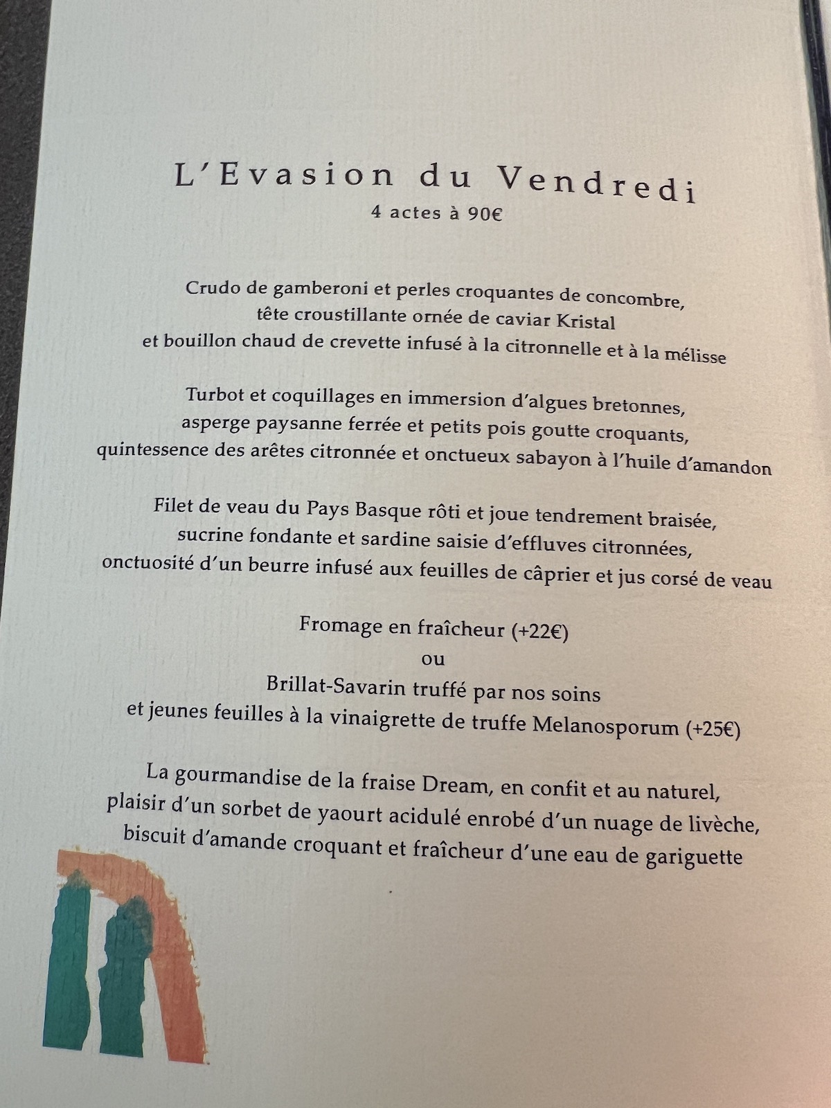 Le menu en 4 plats de ce vendredi, il existe aussi une version en 5 plats à 120€ mais j’ai trouvé que 30€ pour des rougets avec artichauts, c’était un peu trop, nous sommes donc restés sur ce 4 plats et en quantité, c’était largement suffisant.